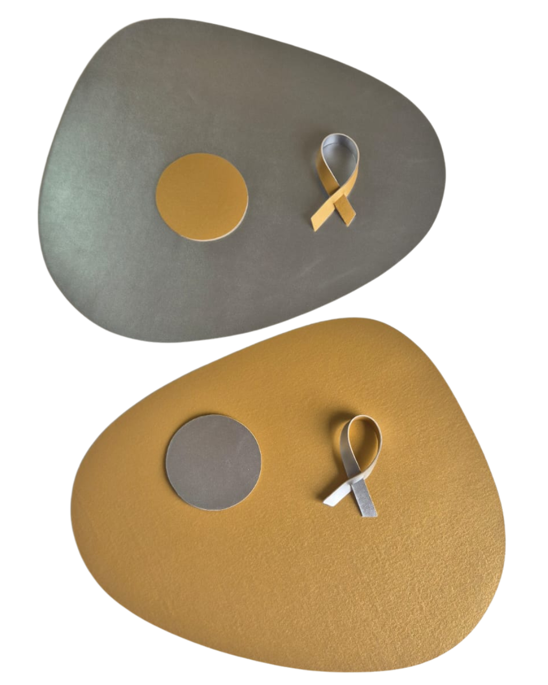 Jogos americanos dupla-face em couro sintético, acompanham porta-copos e porta-guardanapos. Elegância e praticidade á sua mesa.